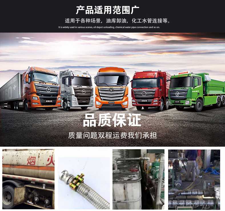 槽車(chē)快裝接頭是一種用于傳輸液體的快裝連接管件,由一個(gè)公頭和一個(gè)母頭構(gòu)成。一般公頭的外部有一個(gè)凹面(槽),連接時(shí)這個(gè)槽剛好被母頭的把手卡住從而使兩端的墊片緊密結(jié)合達(dá)到密封的效果。快裝接頭產(chǎn)品型號(hào)有:A型快裝接頭,B型快裝接頭,C型快裝接頭,D型快裝接頭,DC型快裝接頭,DP型快裝接頭,E型快裝接頭,F(xiàn)型快裝接頭,C型帶法蘭快裝接頭,F(xiàn)型法蘭快裝接頭陰端法蘭快裝接頭,陽(yáng)端法蘭快裝接頭,KJA槽車(chē)快裝接頭,KJB槽車(chē)快裝接頭,,消防車(chē)接頭。消防接頭,母快裝接頭,公快裝接頭,軟管連接快裝接頭,皮管連接快裝接頭,螺紋快裝接頭,焊接快裝接頭,承插式快裝接頭,陽(yáng)端快裝接頭,陰端快裝接頭,內(nèi)螺紋快裝接頭,外螺紋快裝接頭,陰皮管快裝接頭,陽(yáng)皮管快裝接頭,陽(yáng)外螺紋快裝接頭,陰內(nèi)螺紋快裝接頭,陰外螺紋快裝接頭,陽(yáng)內(nèi)螺紋快裝接頭,鋁合金快裝接頭,黃銅快裝接頭,黃銅消防接頭,陽(yáng)端圓法蘭快裝接頭,陰端圓法蘭快裝接頭,扳把式快裝接頭,品種齊全,能更好滿足客戶的需求。槽車(chē)快裝接頭適用于各種場(chǎng)景,油庫(kù)卸油,化工水管連接等。