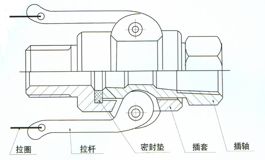 如圖所示,插套兩端分別裝有一偏心凸輪拉桿,將插軸插入插套內(nèi),壓下兩側(cè)拉桿,利用凸輪原理迫使插軸下沉接觸密封墊而實(shí)現(xiàn)制動(dòng)工作,該種接頭具有以下特點(diǎn)。