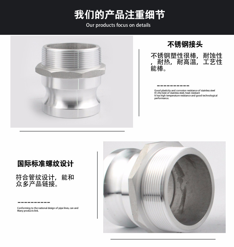 光伏半導(dǎo)體槽車快裝接頭也叫扳把式光伏半導(dǎo)體槽車快裝接頭,它是一種不需要工具就能實現(xiàn)管路連通或斷開的光伏半導(dǎo)體槽車快裝接頭,使用陰陽配套應(yīng)用偏心原理實現(xiàn)制動扳把式凸輪鎖緊,方便快速連接拆卸,中間使用丁腈橡膠墊密封,如需耐腐蝕或者介質(zhì)為強酸強堿可更換氟橡膠密封墊,可配套PP法蘭,常用于涂裝、噴涂、化工、噸桶等設(shè)備的傳輸裝卸,螺紋有英制錐度螺紋(BSPT)和美制螺紋(NPT)。